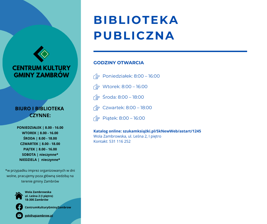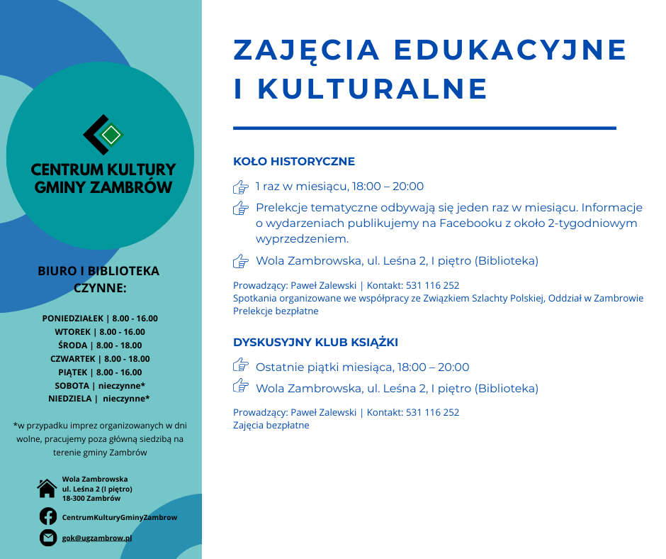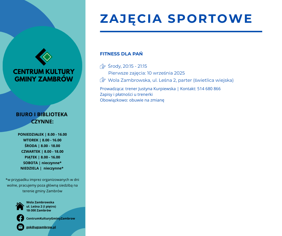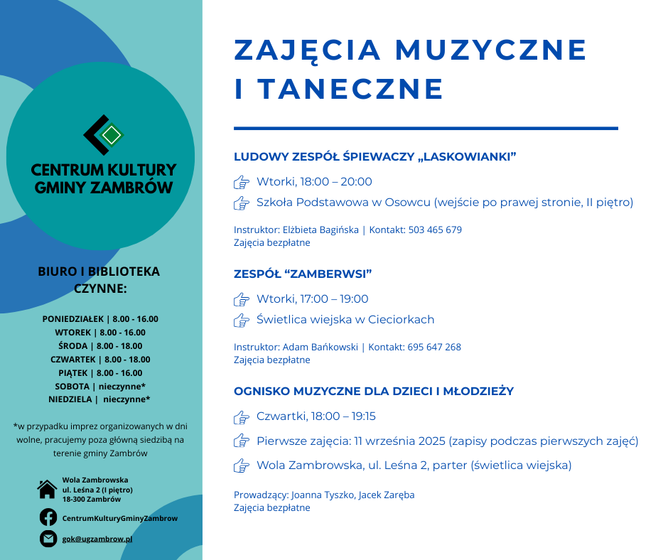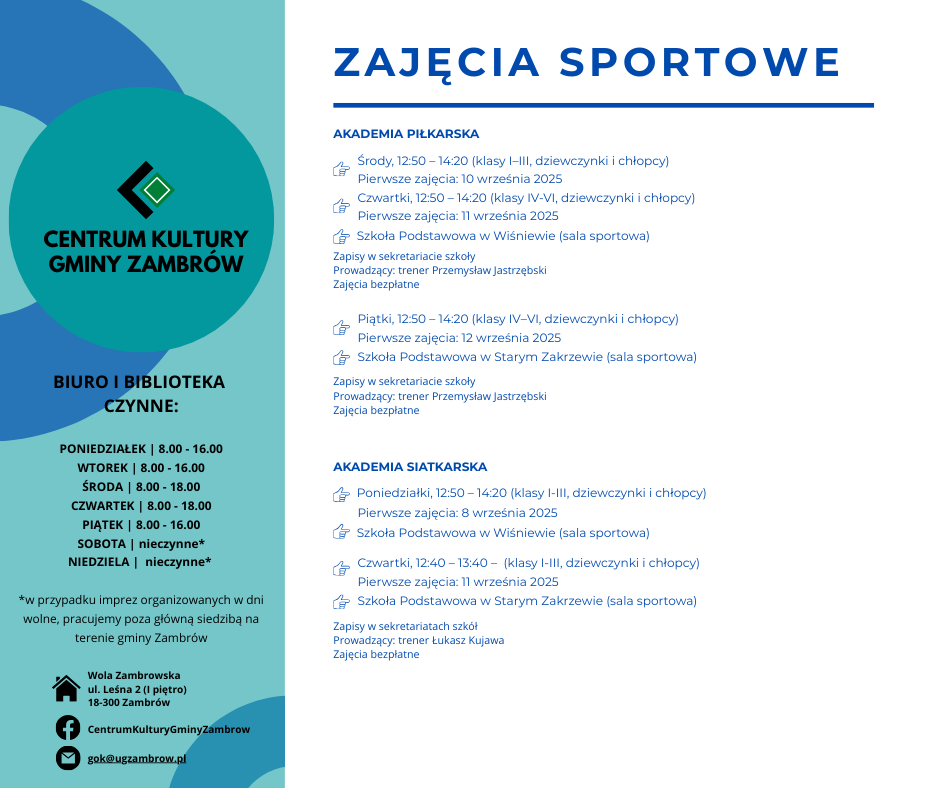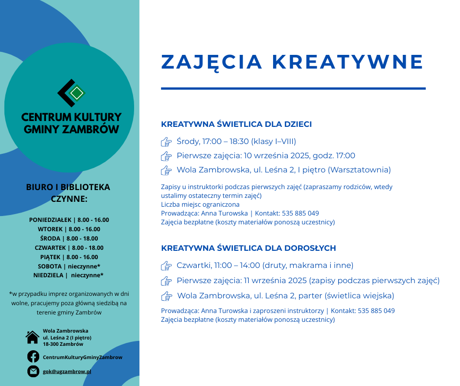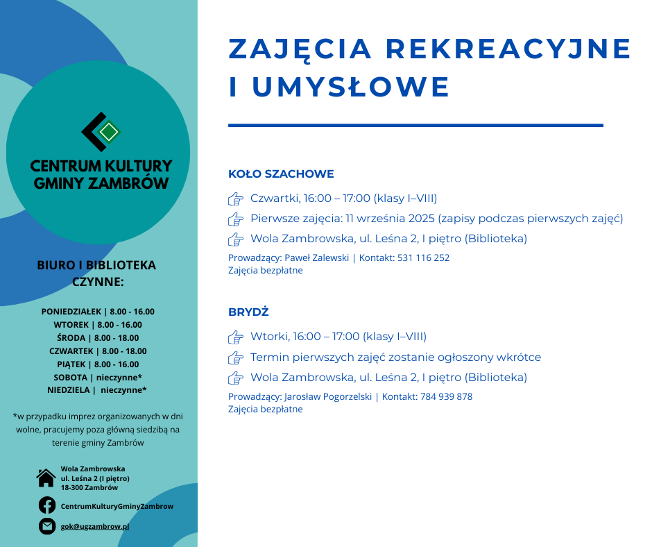 Centrum Kultury Gminy Zambrów przygotowało ofertę zajęć kulturalnych, edukacyjnych, rekreacyjnych i sportowych na nowy sezon 2025/2026. Program skierowany jest do dzieci, młodzieży oraz dorosłych mieszkańców gminy.